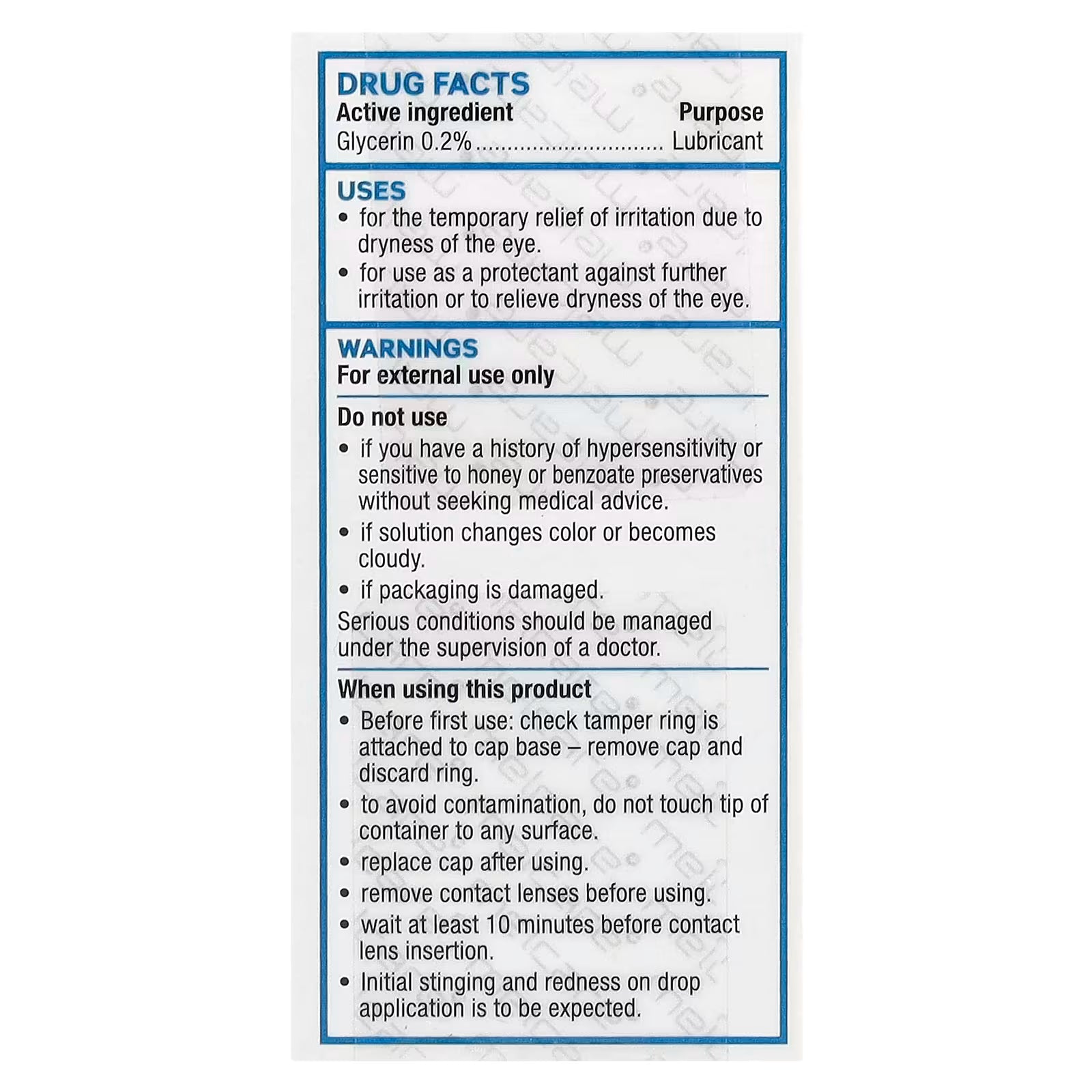 • For use as a protectant against further irritation or to relieve dryness of the eye.