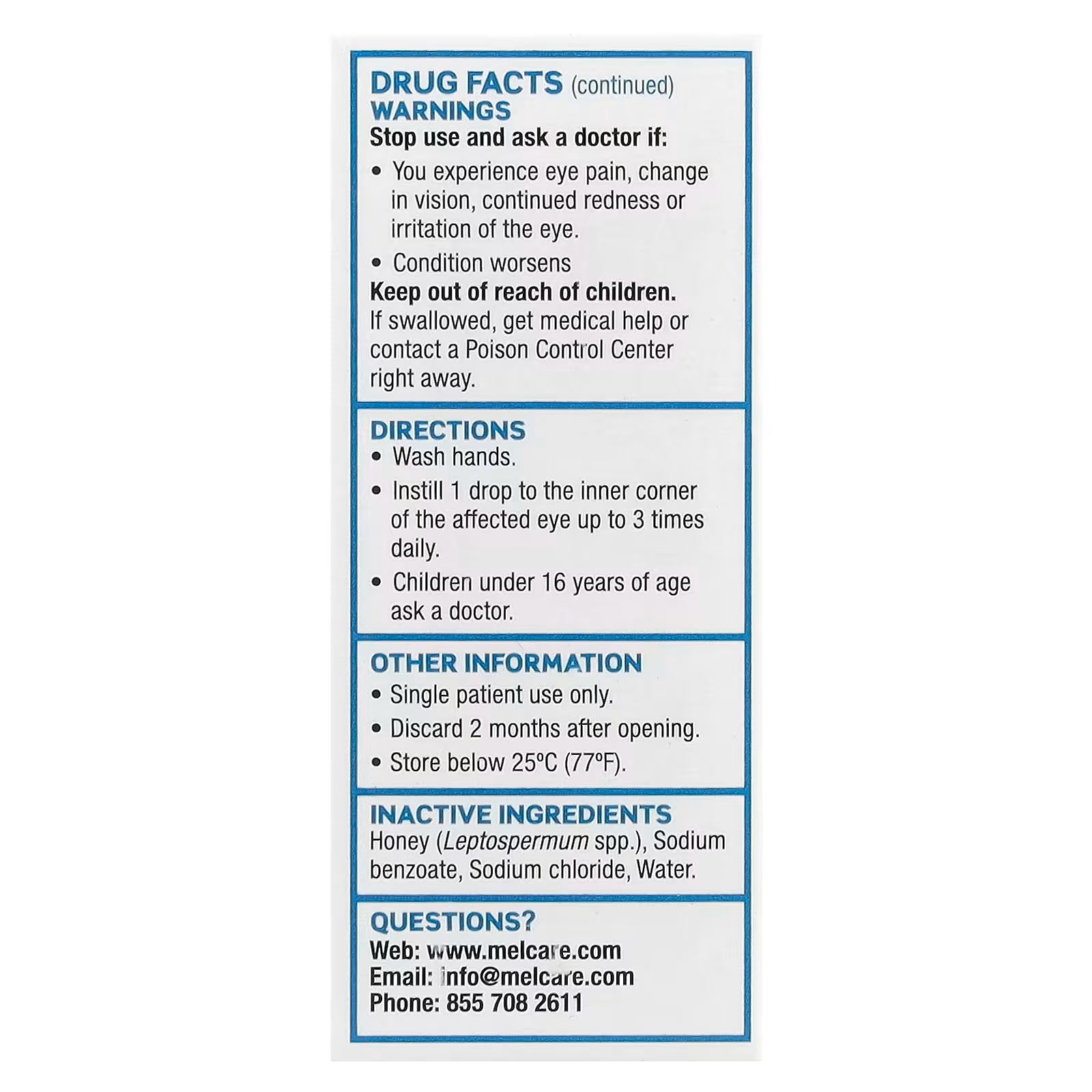 Optimel® Manuka + Dry Eye Drops also contains a proprietary pharmaceutical grade Leptospermum spp. honey (165 mg/g) as an excipient.